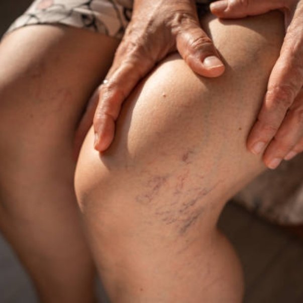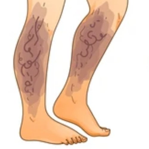 Twisted, rope-like veins often appear on the surface of the legs.